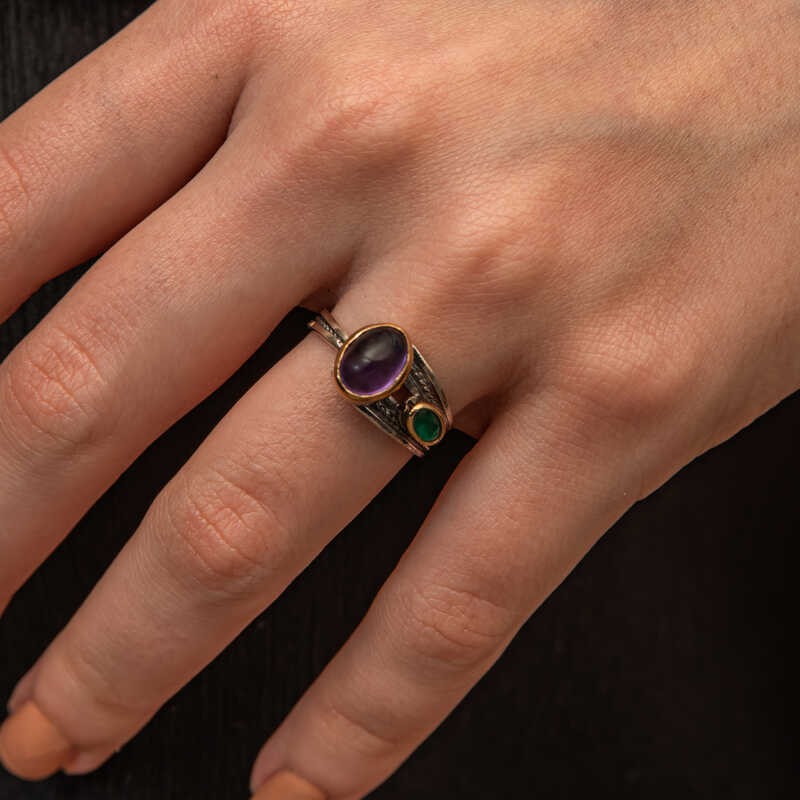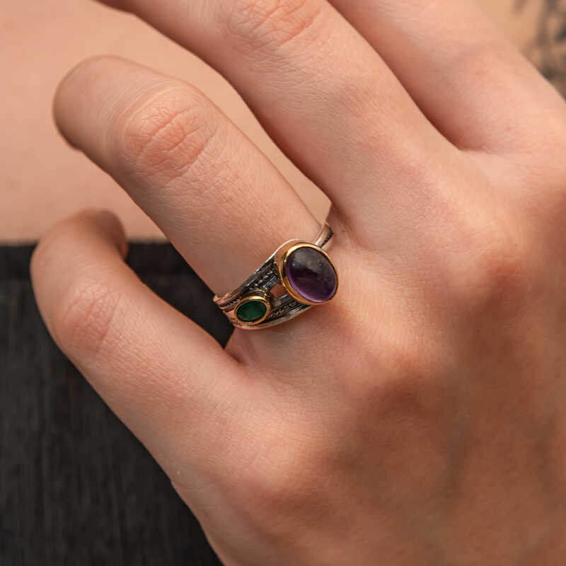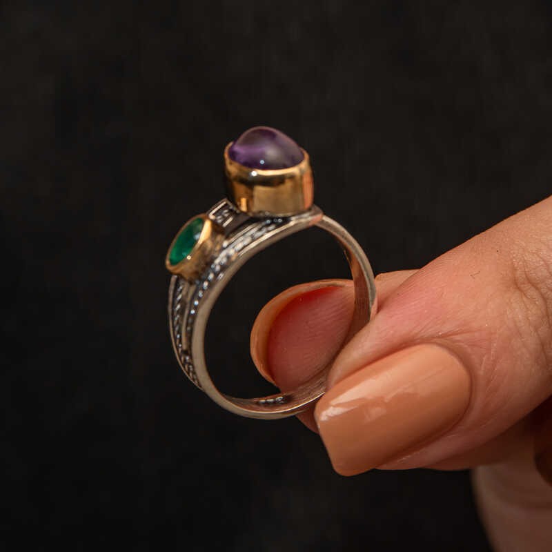 Gümüş Ametist Taşlı Zümrüt Otantik Ayarlanabilir Kadın Yüzük