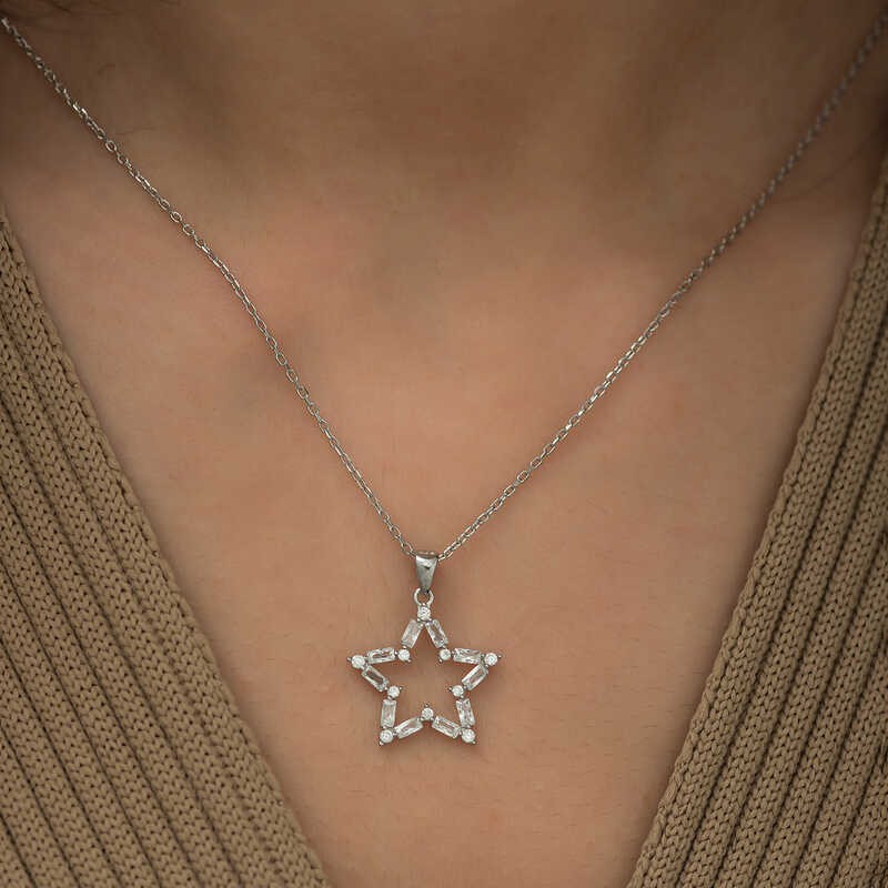 Yıldız, pek çok toplumda ve öğretide şans getirildiğine inanılan uğurlu bir semboldür. Venüs Gezegeninin enerjisini taşır. Venüs Gezegeni, aşk ve aşk enerjisinin de temsilcisidir. Bu şık baget taşlardan oluşan yıldız kolye; doğum günü hediyesi, sevgililer günü hediyesi veya özel günlerde tercih edilebilecek mükemmel bir seçenektir. Gümüş baget taşlı yıldız bayan kolye 925 ayar gümüşten imal edilmiştir. Bu kolye üzerinde rodyum kaplama vardır. Rodyum kaplama yapılan gümüş bayan kolye modelleri parlaklığını uzun süre muhafaza eder. Tüm gümüş bayan kolye modellerimizde olduğu gibi gümüş baget taşlı yıldız bayan kolye modeli de el emeği ile üretilmiştir. Gümüş ve değerli taşlar nedeniyle belirtilen ortalama ürün ağırlığında ± %10 sapma olabilmektedir.