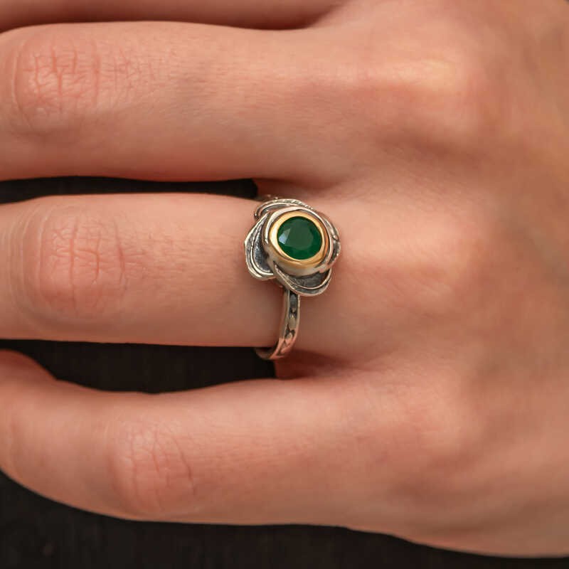 Yeşil çiçek desenli otantik yüzük geleneksel ve modern tarzları bir araya getirerek stilinize ikonik bir dokunuş katıyor.Hem bohem hem de klasik stillerle mükemmel bir uyum sağlar.Doğum günü hediyesi, sevgililer günü hediyesi veya annelere hediye olarak özel günlerde tercih edilebilecek mükemmel bir seçenektir.Gümüş yeşil otantik yüzük 925 ayar gümüşten imal edilmiştir. Gümüş üzerine rodyum kaplama yapılmıştır. Rodyum kaplama yapılan gümüş otantik yüzük parlaklığını uzun süre muhafaza eder ve oksitlenmesi gecikir. Tüm kadın yüzüklerde olduğu gibi gümüş otantik kadın yüzük de el emeği ile üretilmiştir. Gümüş ve değerli taşlar nedeniyle belirtilen ortalama ürün ağırlığında ± %10 sapma olabilmektedir.