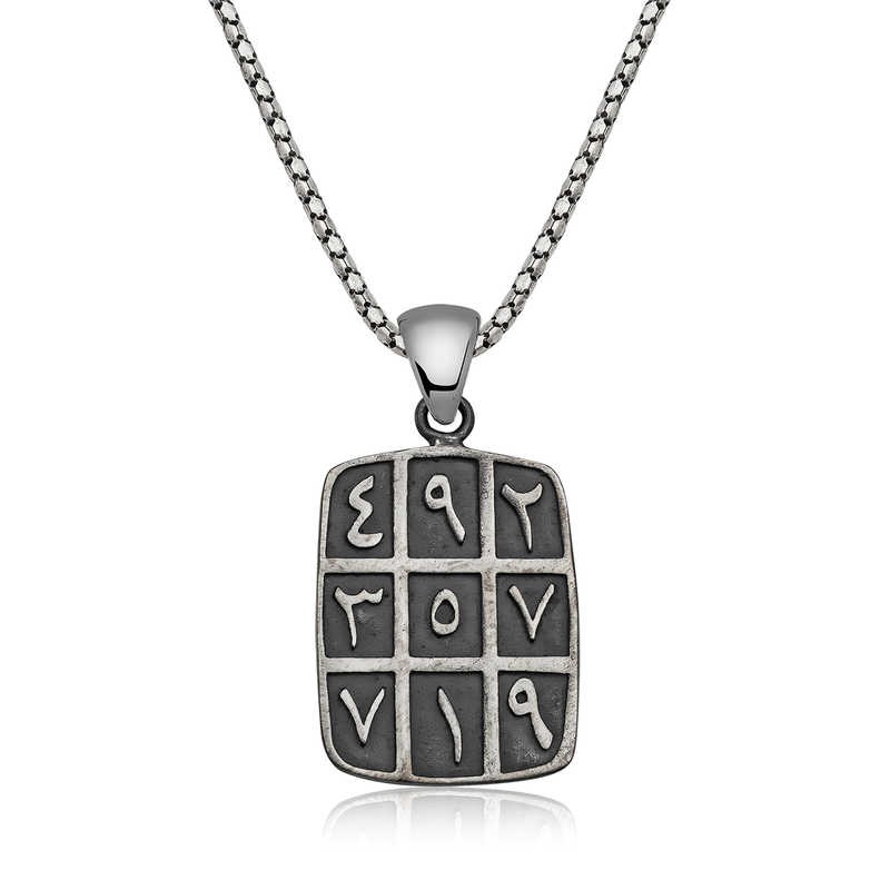 Ebced, geleneksel Arap alfabesinin eski sıralanışından (elif, ba, cim, dal) ilk dört harfinin okunuşlarıyla (E-B-Ce-D) türetilmiş bir sözcüktür. Ebced hesabı ise Ebced rakamları denilen alfabetik bir sayı sistemini kullanarak, kelime, cümlecik veya cümlelerin sayısal değerini hesaplama ve bunlardan anlamlar çıkartma işlemidir. Teori incelenen kelime, cümlecik veya metinde bir şekilde gizli şifreleme bulunduğu varsayımına dayanır. 925 ayar gümüşten imal edilmiştir. Gümüş üzerine oksit kaplama yapılmıştır. Oksit kaplama yapılan gümüş kolye modelleri parlaklığını uzun süre muhafaza eder ve oksitlenmesi gecikir. Gümüş olan zincir boyu ortalama 55 cm'dir. Bu ebced kolye modeli diğer gümüş kolye modellerinde olduğu gibi el emeği ile üretilmiştir. Gümüş ve değerli taşlar nedeniyle belirtilen ortalama ürün ağırlığında ± %10 sapma olabilmektedir.