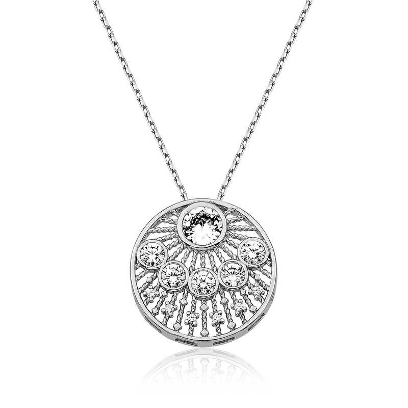 Beyaz zirkon taşlarla süslenmiş etnik desenli bayan kolye, şık ve ışıltıyı sevenler için tasarlandı. Günün her anında severek kullanabileceğiniz, herkesin beğenisini toplayabilecek ve göz kamaştırabilecek bir üründür. Gümüş etnik desenli bayan kolye 925 ayar gümüşten imal edilmiştir. Bu kolye üzerine rodyum kaplama yapılmıştır. Rodyum kaplama yapılan ürünler parlaklığını uzun süre muhafaza eder. Üzerinde bulunan taşlar zirkon'dur. Tüm gümüş bayan kolye modellerinde olduğu gibi gümüş etnik desenli bayan kolye modeli de el emeği ile üretilmiştir. Gümüş ve değerli taşlar nedeniyle belirtilen ortalama ürün ağırlığında ± %10 sapma olabilmektedir. Ürünlerimizin tamamı el emeği ile üretilmiştir.