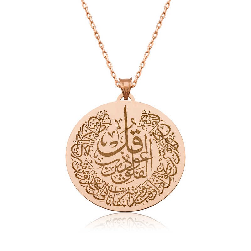 Felak Suresi; Mekke'de nazil olmuş olup 5 ayettir. Adını ilk ayetinde geçip sabah manasına geldiği gibi yarmak manasına da gelen "Felak" kelimesinden almıştır. Felak ve Nas suresine Muavvizeteyn denir. İki sığındırıcı manasındadır. İnsanoğlu her türlü bela ve kazalara karşı tedbir (önlem) almakla beraber herşeyin sahibi ve yaratıcısı olan Allâh"a sığınması en güvenli yoldur. Çok iyi bilinir ki, görünen ve görünmeyen insana dehşet (korku) veren hadiseler vardır. İşte Felâk ve Nâs Sûreleri böyle tehlikeli durumlardan zarar görmemek için okunması emir ve tavsiye edilen sûrelerdir. Kolye; 925 ayar gümüşten imal edilmiştir. Gümüş üzerine rose altın kaplama yapılmıştır. Rose altın kaplama yapılan gümüş ürünler parlaklığını uzun süre muhafaza eder, oksitlenmesi gecikir. Tüm gümüş kolyelerde olduğu gibi gümüş felak bayan kolye de tamamı el emeği ile üretilmiştir. Ürün hediye kutusunda gönderilecektir... Gümüş ve değerli taşlar nedeniyle ürün ağırlığında ± %10 sapma olabilmektedir.