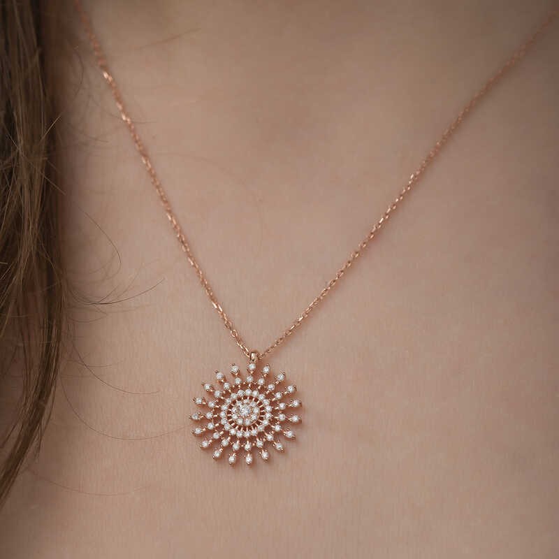 Güneş; ışığın, bilginin, iyiliğin, gücün ve yönetimin sembolüdür. Bu ışıl ışıl ve farklı tasarımıyla göz kamaştıran kolye; 925 ayar gümüşten imal edilmiştir. Gümüş üzerine rose altın kaplama yapılmıştır. Rose altın kaplama yapılan gümüş ürünler parlaklığını uzun süre muhafaza eder, oksitlenmesi gecikir. Gümüş beyaz taşlı güneş bayan kolye üzerinde bulunan taşlar zirkon'dur. Tüm gümüş kolyelerde olduğu gibi gümüş güneş bayan kolye de tamamı el emeği ile üretilmiştir. Gümüş ve değerli taşlar nedeniyle belirtilen ortalama ürün ağırlığında ± %10 sapma olabilmektedir.