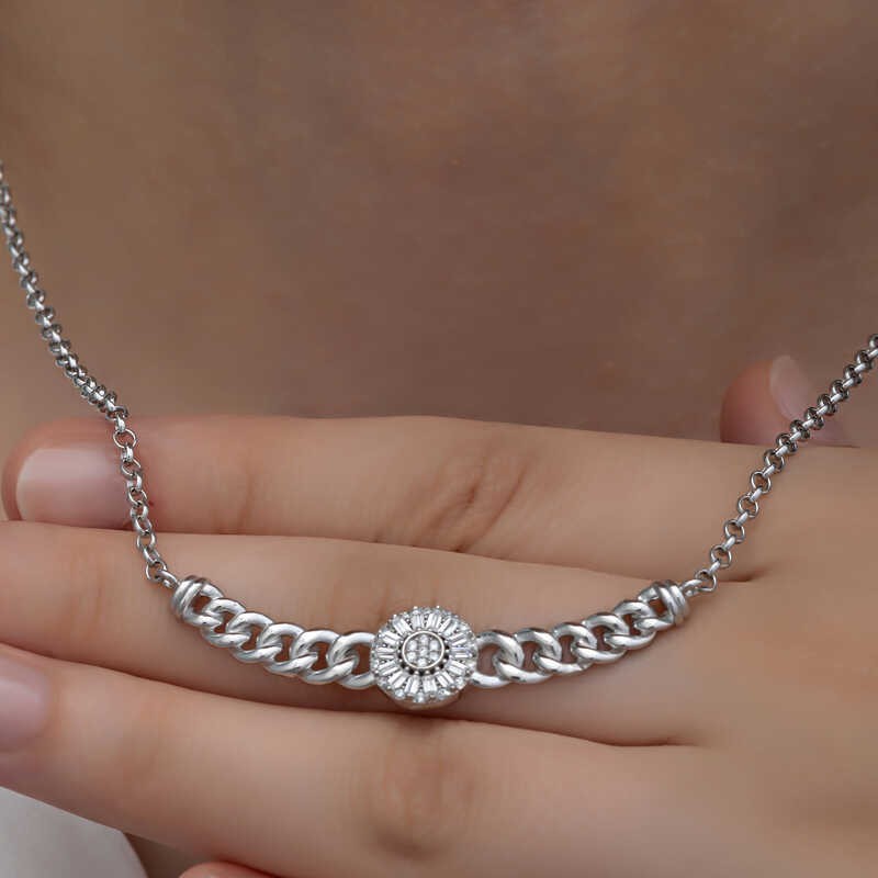 Gümüş Gurmet Zincirli Yuvarlak Baget Taşlı Kadın Kolye