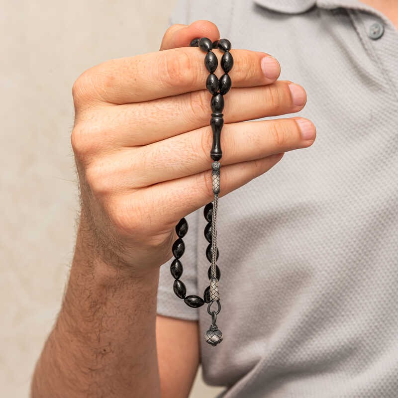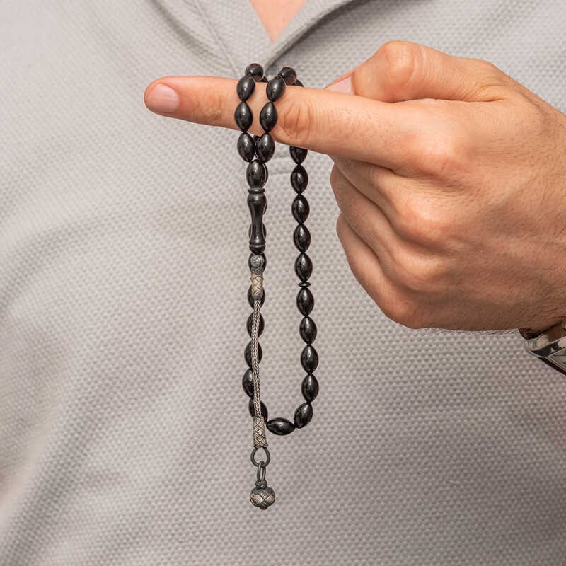 Gümüş Kazaz Püsküllü Siyah Sıkma Kehribar Tesbih
