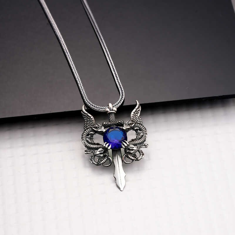 Gümüş Mavi Taşlı Ejderha Erkek Kılıç Kolye