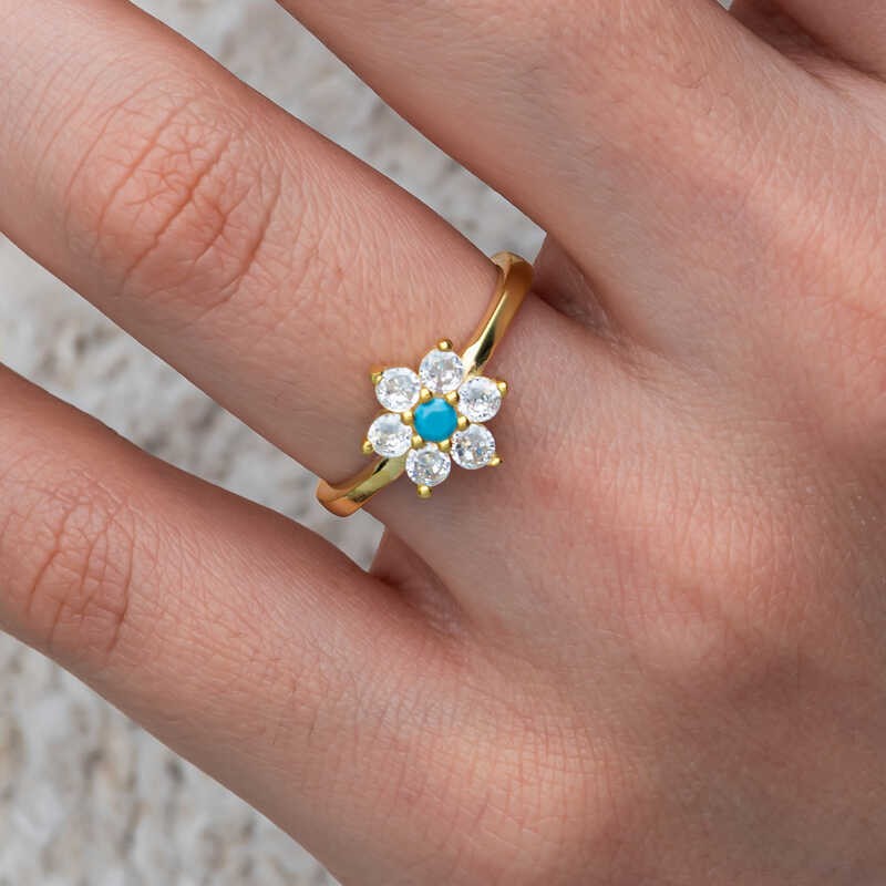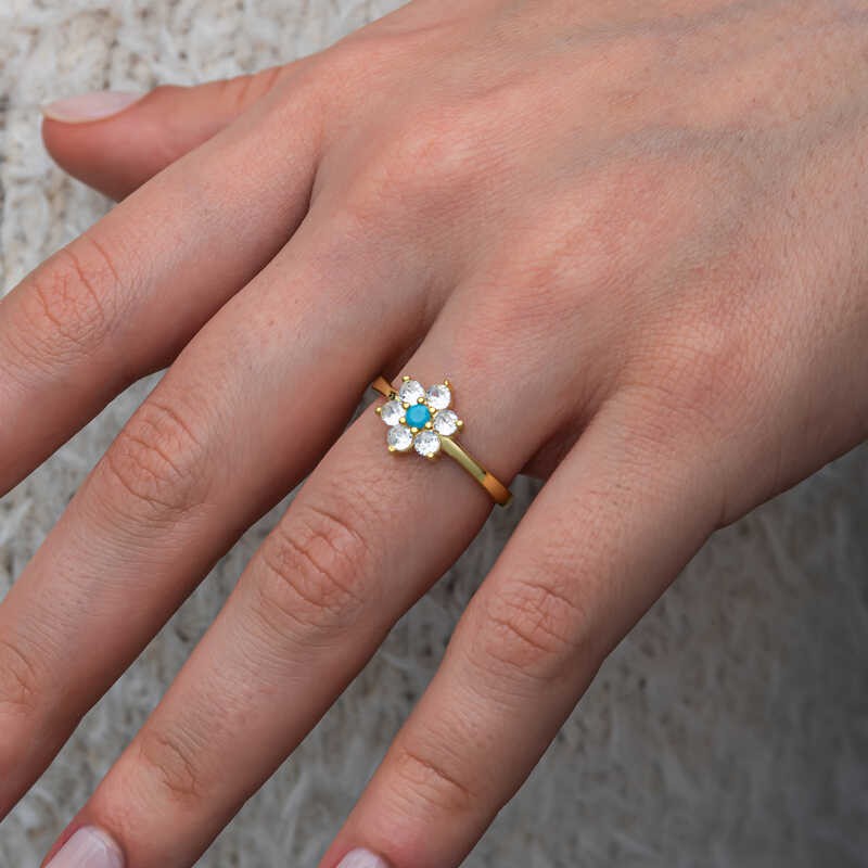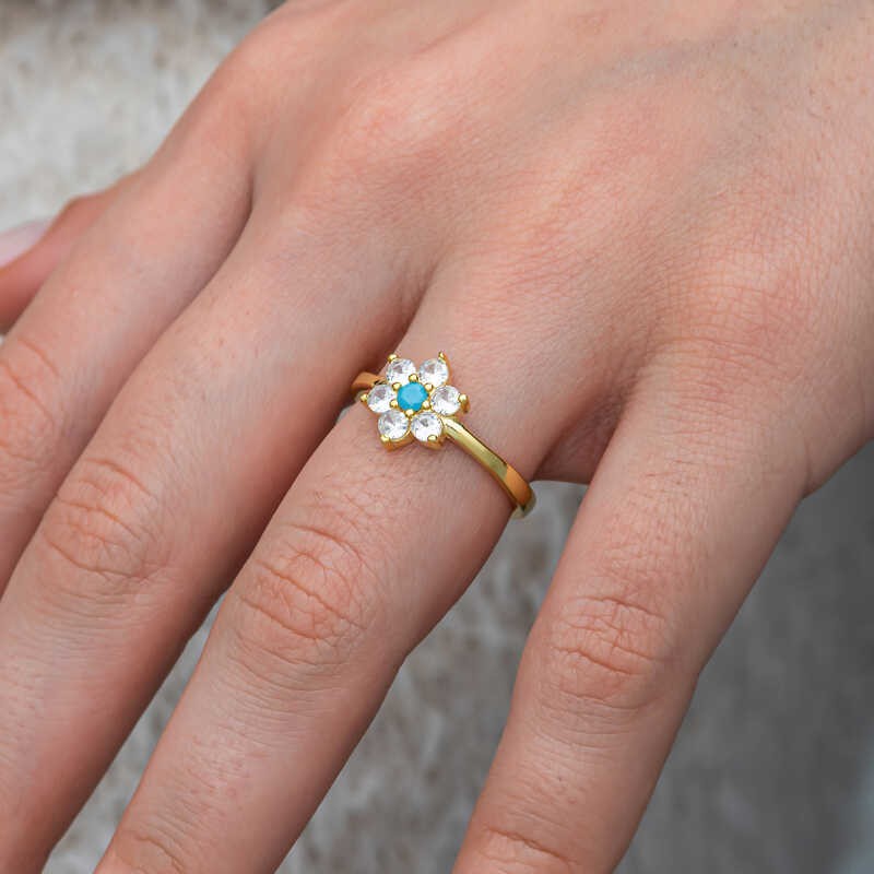 Çiçek yüzük,genellikle sevgi,dostluk,doğa ve güzelliği simgeler.Özel günlerde verilecek hediyeler arasında olan çiçek,bu kez farklı bir yorumla tasarlandı...Çiçek yüzük sevgisini bir kez daha anlatmak isteyenleri,sen bir çiçeksin demek isteyenleri bekliyor.Bu şık yüzük;doğum günü hediyesi,anneler günü,sevgililer günü veya özel günlerde tercih edilebilecek mükemmel bir seçenektir.Gümüş mavi taşlı gold çiçek kadın yüzük 925 ayar gümüşten imal edilmiştir.Gümüş üzerine gold kaplama yapılmıştır.Gold kaplama yapılan gümüş kadın yüzük modelleri parlaklığını uzun süre muhafaza eder ve oksitlenmesi gecikir.Küpe üzerinde bulunan taş zirkondur.Tüm kadın gümüş küpe modellerinde olduğu gibi gümüş mavi taşlı çiçek kadınyüzük de el emeği ile üretilmiştir.Gümüş ve değerli taşlar nedeniyle belirtilen ürün ağırlığında ± %10 sapma olabilmektedir.