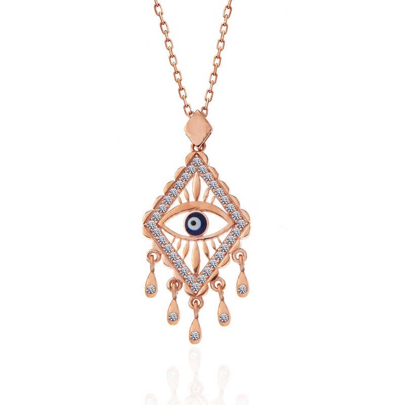 Birçok kültürde kötü enerjinin zararlarından korunmak için çeşitli tılsımlar kullanılmıştır. Doğu kültürlerinin çoğunda kullanılan tılsım ise gözdür. Nazar boncuğu da göz şeklinden ilham alınarak tasarlanmıştır. Mavi rengin seçilmesi de tesadüf değildir. Renkli gözlü kişilerin enerjisini daha etkili yansıttığı inancı gereği nazar boncukları çoğunlukla mavi olarak tasarlanır. Güzelliğiyle göz kamaştıran, nazardan korunmasını istediğiniz kişilere ve sevdiklerinize gümüş nazarlı göz kolyeyi armağan edebilirsiniz. Gümüş kolye üzerinde rose kaplama yapılmıştır. Rose kaplama yapılan gümüş kadın kolyeler parlaklığını uzun süre muhafaza eder, oksitlenmesi gecikir. Gümüş olan zincir boyu ortalama 45 cm'dir. Ürünlerimizin tamamı el emeği ile üretilmiştir. Gümüş ve değerli taşlar nedeniyle ürün ağırlığında ± %10 sapma olabilmektedir.