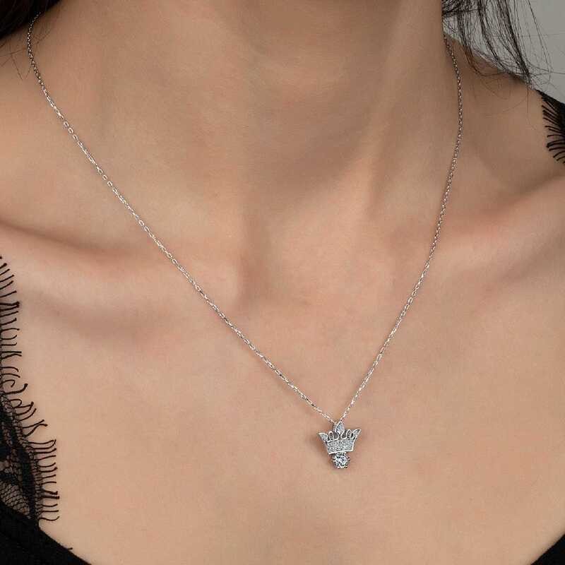 Swarovski Taşlı Gümüş Kral Tacı Tektaş Bayan Kolye