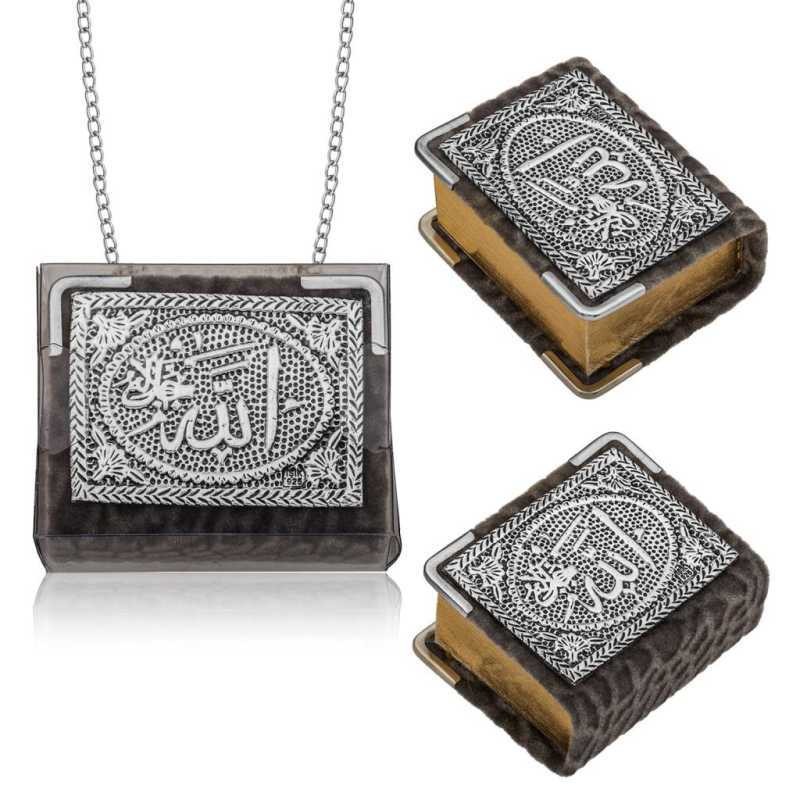 Gümüş Zincirli Küçük Kur'anı-ı KerimKur'an-ı Kerim, İslam dininin ana kitabıdır. Müslümanlara göre, Kur'an ayetleri Allah tarafından Cebrail adındaki melek aracılığıyla İslam peygamberi Muhammed'e vahiyler halinde indirilen bir kutsal kitaptır.İslam inancında, Kur’ân, Muhammed'in en önemli ve en büyük mucizesi ve onun gerçek bir peygamber olduğunun kanıtı olarak görülür. Kur'an-ı Kerim kapağı bordo kadife ve üzeri 925 ayar gümüş kaplamadır. Sayfaları altın yaldızlıdır. Zincirli Kur'an-ı Kerim araba aynasına ya da farklı yerlere asılarak da kullanılabilir. Sevdiklerinize manevi değeri olan bir hediye vermek istiyorsanız tercih edebileceğiniz hoş bir seçenektir.Ürün Eni: 5.00 cmÜrün Boyu: 6.00 cmÜrün Ağırığı: 50.00 grÜrünlerimizin tamamı el emeği ile üretilmiştir ve değerli taşlar nedeniyle ürün ağırlığında ± %10 sapma olabilmektedir.