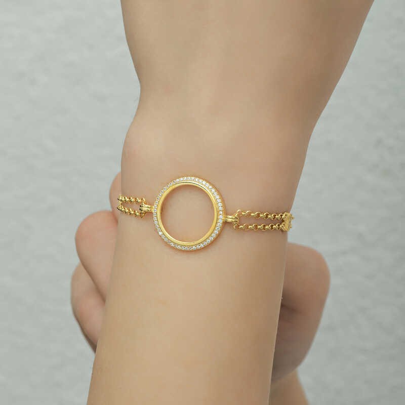 Yuvarlak form deseniyle şıklığı ifade eden gümüş çeyrek takılabilen altın kadın bileklik modeli ile sevginiz, sevdiğiniz kadının teninde hayat bulsun. Genç sevgililerin ve kendini genç hissedenlerin özel günlerde de seçebileceği bu kadın bileklik modeli ile sevdiğinizin bileğini aşkla süsleyin. Sizin olduğu kadar sevdiklerinizin de keyifle takacağı kadın bileklik sevdiğinize en güzel hediyelerden biri olacaktır. Bu kadın bileklik modeli 925 ayar gümüşten imal edilmiştir. Gümüş üzerine altın kaplama yapılmıştır. Altın kaplama yapılan gümüş kadın bileklik modelleri parlaklığını uzun süre muhafaza eder ve oksitlenmesi gecikir. Bileklik üzerinde bulunan beyaz taşlar zirkondur. Tüm kadın bileklik modellerinde olduğu gibi gümüş kadın bileklik modeli de el emeği ile üretilmiştir. Gümüş ve değerli taşlar nedeniyle belirtilen ortalama ürün ağırlığında ± %10 sapma olabilmektedir.