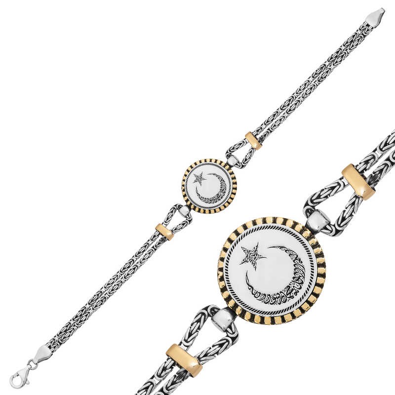 Türk bayrağının ilhamını da kan gölüne yansıyan ay ve yıldızdan aldığını biliyoruz. Bayrağın taşıdığı kutsal anlamı bileklerinde taşımak ve sevdiklerinizle paylaşmak için kaçırılmayacak bir fırsat sunuyoruz. Bu şık Ay yıldız bileklik modeli 925 ayar gümüşten imal edilmiştir. Gümüş üzerine oksit kaplama yapılmıştır. Gümüş oksit, kaplanan ürünler hafif siyah renklendirmeye ve antik bir görünüm elde etmeye yaramaktadır. Ay yıldız erkek bileklik 925 ayar gümüşten imal edilmiştir. Gümüş ve değerli taşlar nedeniyle belirtilen ortalama ürün ağırlığında ± %10 sapma olabilmektedir.