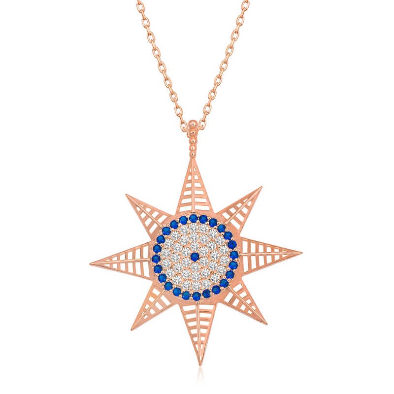 Kutup yıldızı milyonlarca yıldızdan sadece biridir ama aydan en çok etkilenen yıldızdır. Tek isteği aya kendisini beğendirmektir. Ağladıkça parıldar onun da yüreği ve ayın ne kadar soğuk olduğunu düşünür. Onun yerine üşür. Dünya üzerinde görüldüğü her anı aslında onun gerçeğe dönüşen düşüdür. Gökyüzü ne kadar büyükse kutup yıldızı o kadar küçüktür. Kutup yıldızı ulaşamaz aya ne kadar hızlı ilerlese de, ne de ay güneşe. Güneş sıcağından vazgeçip dönmez yüzünü ona. Siz de kıyamete kadar bitmeyecek aşkınızı bu anlamlı nazarlı kutup yıldızı kadın kolye ile taçlandırın. Bu şık kolye modeli 925 ayar gümüşten imal edilmiştir. Gümüş üzerine rose kaplama yapılmıştır. Rose kaplama yapılan gümüş kolyeler parlaklığını uzun süre muhafaza eder, oksitlenmeyi geciktirir. Üzerinde bulunan taşlar zirkondur. Zincir boyu ortalama 45 cm'dir. Ürünlerimizin tamamı el emeği ile üretilmiştir. Gümüş ve değerli taşlar nedeniyle belirtilen ortalama ürün ağırlığında ± %10 sapma olabilmektedir.