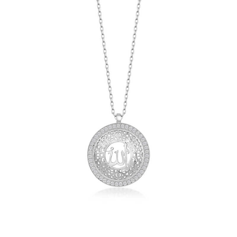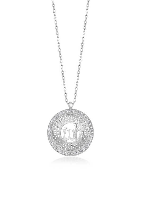 99 güzel isminden birincisi olan Allah yazılı kolyemiz ile göz alıcı şıklığınızı tamamlayın. Bu güzel kolye modelimiz 925 ayar gümüşten imal edilmiştir. Gümüş üzerine rodyum kaplama yapılmıştır. Rodyum kaplama yapılan gümüş kadın kolye modellerimiz parlaklığını uzun süre muhafaza eder, oksitlenmesi gecikir. Bu Allah yazılı kolyenin zincir uzunluğu ortalama 45 cm’dir. Tüm kadın kolye modellerimizde olduğu gibi Allah yazılı gümüş kadın kolye de el emeği ile üretilmiştir ve değerli taşlar nedeniyle ürün ağırlığında ± %10 sapma olabilmektedir.