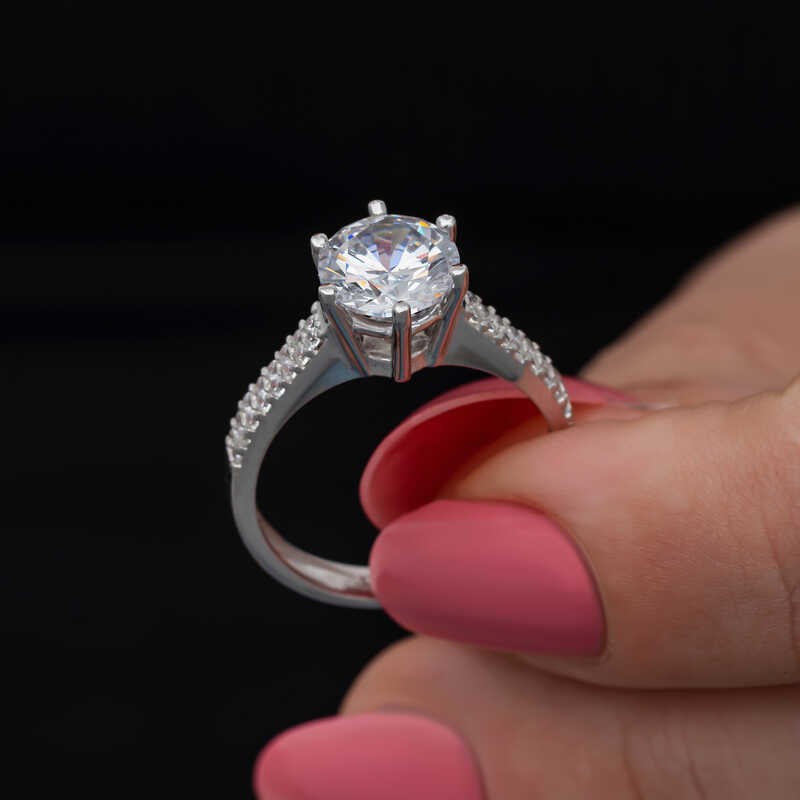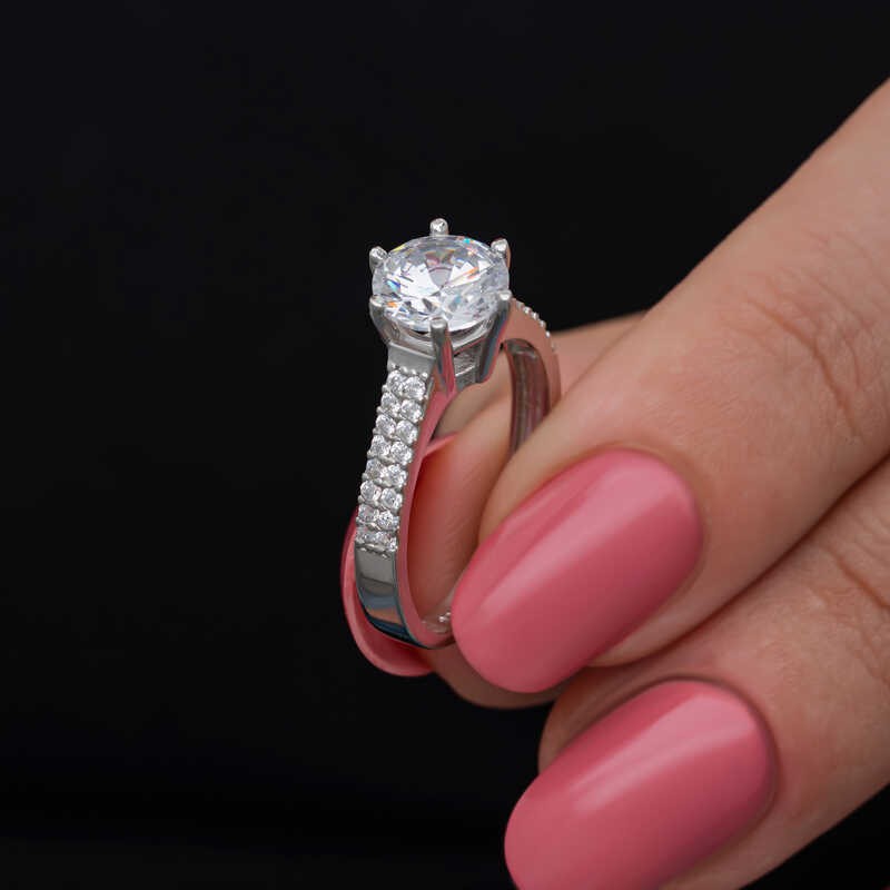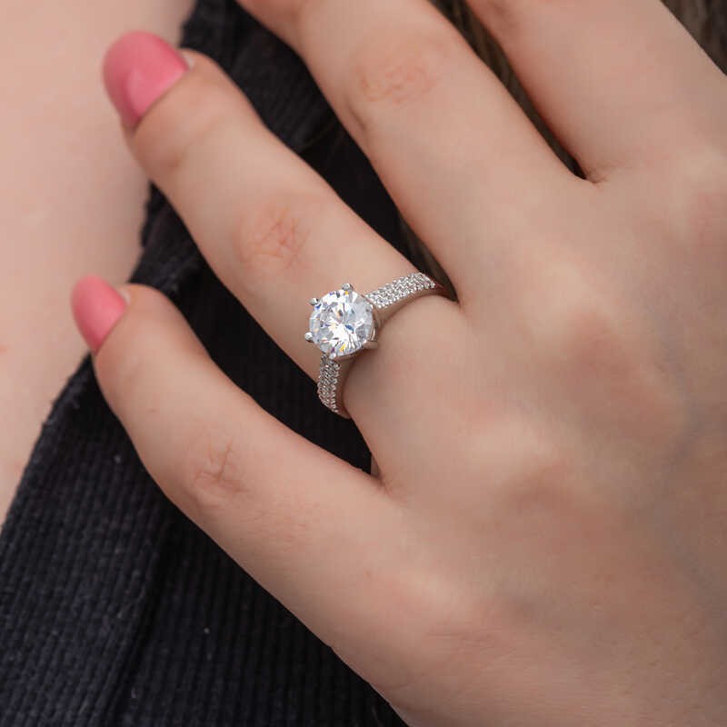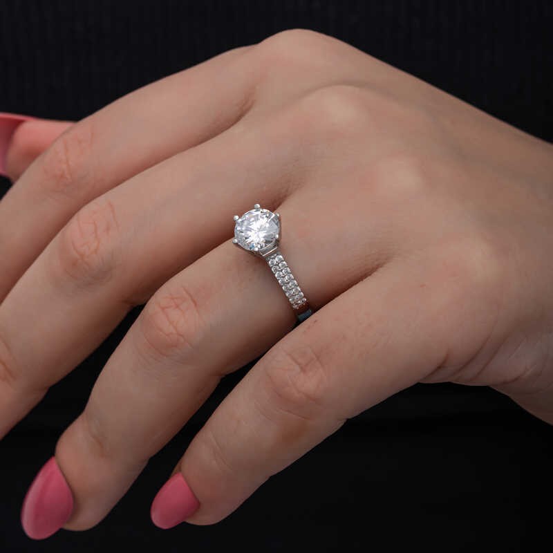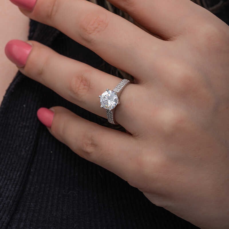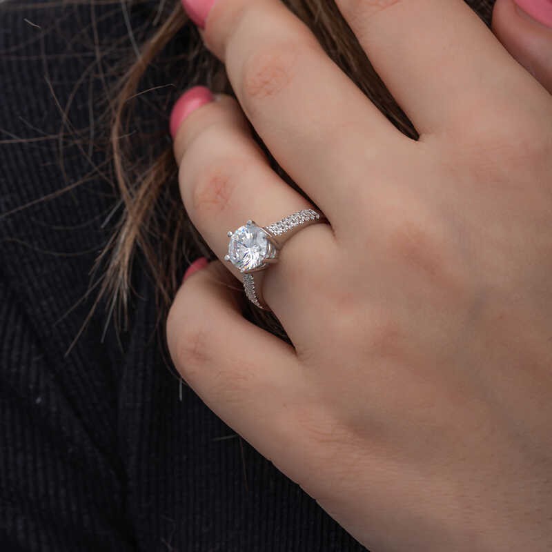 Bu özel tasarım tek taş yüzük 925 ayar gümüşten imal edilmiştir. Gümüş üzerine rodyum kaplama yapılmıştır. Rodyum kaplama yapılan kadın gümüş yüzük modelleri parlaklığını uzun süre muhafaza eder, oksitlenmesi gecikir. Yüzük üzerinde bulunan taşlar zirkondur. Sevdiğinize doğum günü, sevgililer günü ve özel günlerde verebileceğiniz mükemmel bir hediye seçeneğidir. Gümüş kadın yüzük modellerimizin tamamında olduğu gibi bu tek taş kadın yüzük de tamamen el emeği ile üretilmiştir. Gümüş ve değerli taşlar nedeniyle belirtilen ortalama ürün ağırlığında ± %10 sapma olabilmektedir.