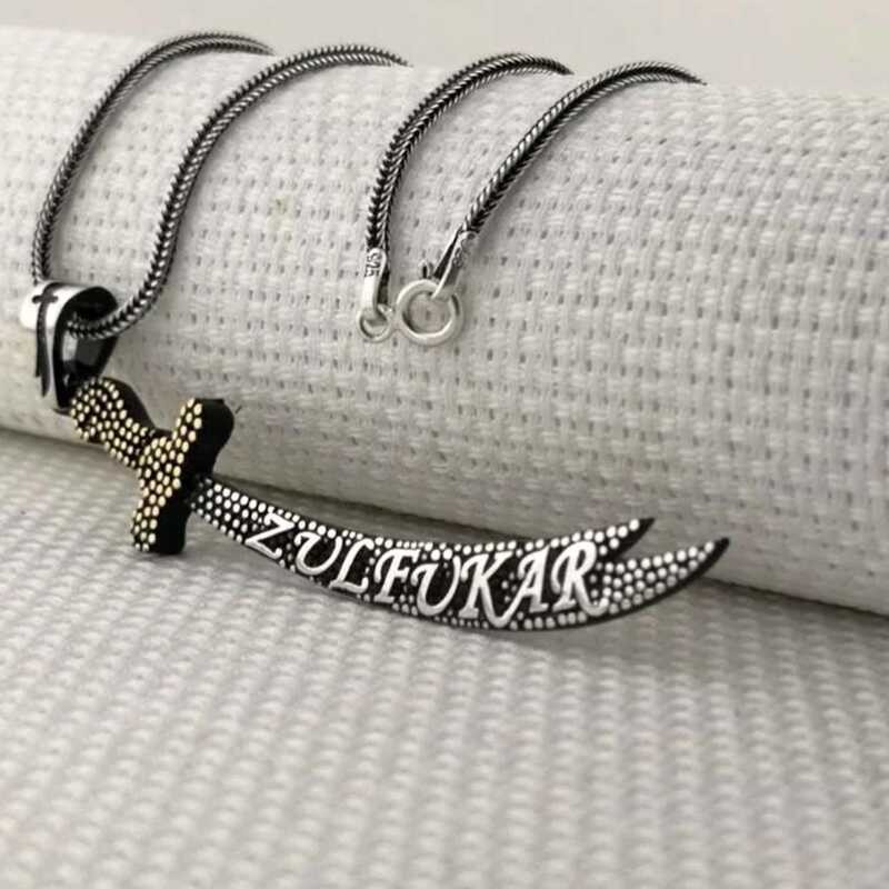 Hz. Ali Uhud savaşında çokca kahramanlık göstermiştir. Savaşta Peygamber Efendimizi korumak isterken kılıcı kırılır.Bunu gören Peygamber Efendimiz kendi kılıcı olan Zülfikar’ı kendisine vermiştir. Kılıcın keskinliği ile diğer kılıçları ortadan ikiye ayırmış ve savaşlarda destanlar yazdırmıştır. Hz. Ali Zülfikar kılıcıyla beraber savaşlardadır artık... Hz. Alinin vefatından sonra kılıcın cennete götürüldüğü biliniyor.Bir başka rivayete göre ise Dicle ve Fırat nehirlerinin arasında olduğu biliniyor. İslam ordularına hükmedecek kişi o kılıcın sahibi olup orduların başkomutanı olacaktır. Bu şık kolye; doğum günü hediyesi, sevgililer günü hediyesi veya hediye olarak özel günlerde tercih edebilirsiniz. Kolye; 925 ayar gümüşten imal edilmiştir. Gümüş üzerine oksit kaplama yapılmıştır. Oksit kaplama yapılan gümüş kolyeler parlaklığını uzun süre muhafaza eder, gümüşe siyah rengi verir. Tüm kolyelerde olduğu gibi bu gümüş zülfikar kılıcı kolye de tamamı el emeği ile üretilmiştir. Üzerinde bulunan taşlar zirkondur. Gümüş ve değerli taşlar nedeniyle belirtilen ortalama ürün ağırlığında ± %10 sapma olabilmektedir.