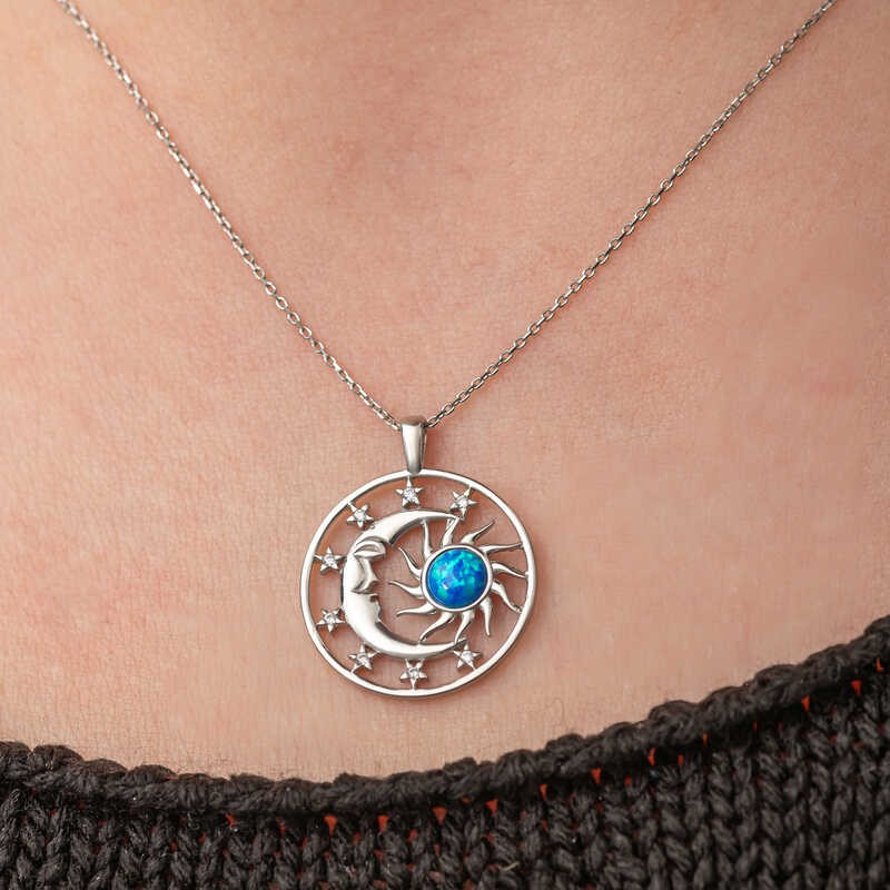 Gümüş Opal Mavi Taşlı Ay Güneş Kadın Kolye