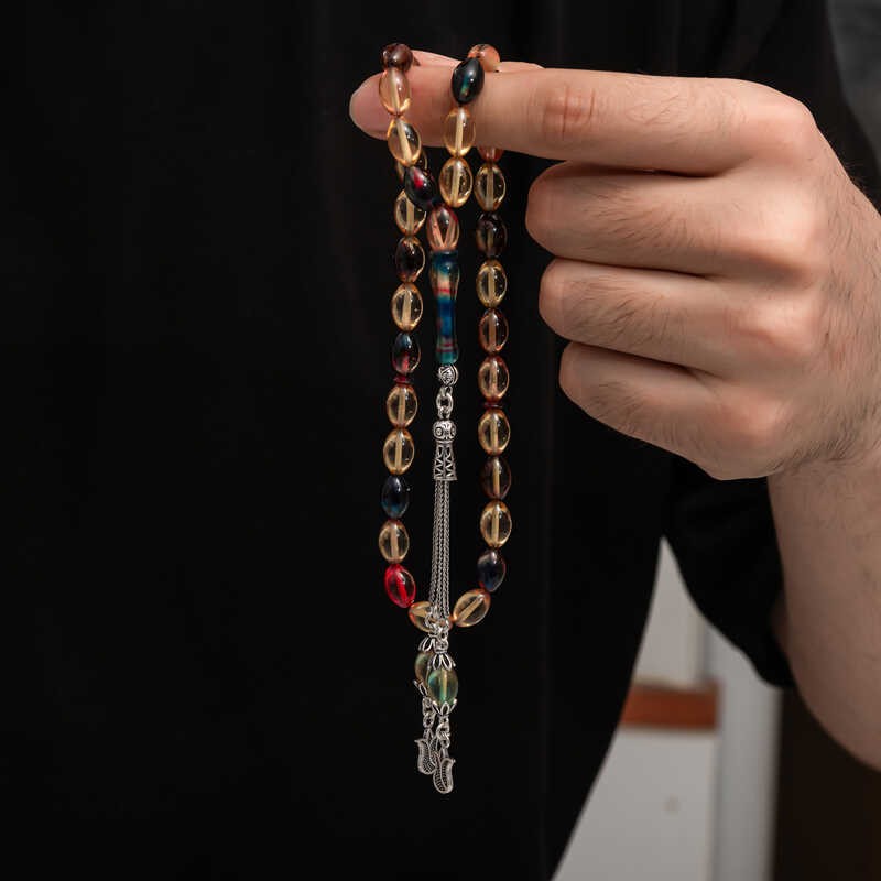 Kehribar, çam ağacı reçinesinin toprak altında uzun yıllar boyunca birikerek oluşan bir maddedir. Hemen hemen taş ile aynı sertliktedir fakat yoğunluğu düşüktür. Çam kokusu yayar. Oluşumu uzun zaman aldığından ve yapay olarak yapılamadığından değerli bir maddedir. Sıkma kehribar ise kehribar taşından farklı olarak onun özelliklerini taşıyan, görüntü itibariyle ona benzeyen fakat gerçek olmayan bir malzemedir. Ülkemizde ve dünyanın bir çok yerinde kehribar taşından çeşitli malzemeler üretilmiştir. Ülkemizde en yaygın olarak tesbih üretilmektedir. Kehribar tesbihler elde ısındıkça kehribar benzeri bir koku verir ve renk değiştirir. Bir çok rengi vardır. Hatta iki rengin birleşiminden oluşan kehribar tesbih modelleri de vardır. Genellikle gümüş püskül ile kullanılır veya sistemli olarak da kullanılabilir. Ülkemizin güzide tesbih ustaları bu malzemeyi sıklıkla işlemek suretiyle çeşitli sanat eserleri meydana getirirler. Bu tesbihler de koleksiyonerler tarafından alınıp satılmaktadır. Gümüş püsküllü sıkma kehribar tesbih modeli de günlük hayatta kullanılabilecek çok şık bir tesbih çeşididir. Özel günlerin vazgeçilmez hediyesi sıkma kehribar tesbihler erkekler için doğum günü, sevgililer günü ve babalar günü gibi özel zamanlarda hediye olarak tercih edilebilir. Gümüş püsküllü sıkma kehribar tesbih modeli diğer kehribar tesbih modellerinde olduğu gibi tamamen el emeği ile imal edilmiştir.