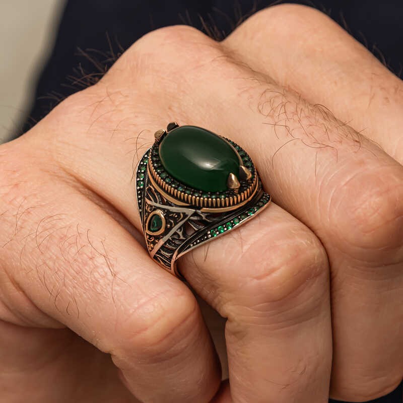 Gümüş Yeşil Akik Taşlı Erkek Yüzük