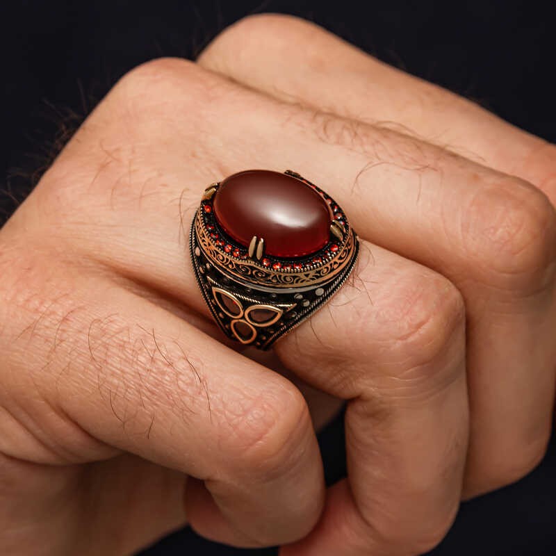 Kırmızı akik taşı, tarih boyunca cesaretin, gücün ve canlılığın sembolü olarak kabul edilmiştir. Eski çağlarda savaşçılar, bu taşı cesaretlerini artırmak ve savaş meydanlarında güçlü bir duruş sergilemek amacıyla yanlarında taşımıştır. Günümüzde ise kırmızı akik, bireysel güç ve kararlılık simgesi olarak değerlendirilmektedir. Kırmızı rengin enerjisiyle doğrudan bağlantılı olan bu taş, bireylerin içsel gücünü keşfetmesine ve kendine olan güvenini artırmasına katkı sağlayabilir. Kendinize yada sevdiklerinize doğum gününde, babalar gününde yada özel günlerde hediye edebilirsiniz. Gümüş üzerine oksit kaplama yapılmıştır. Oksit kaplama yapılan gümüş erkek yüzük modelleri parlaklığını uzun süre muhafaza eder, oksitlenmesi gecikir. Gümüş ve değerli taşlar nedeniyle belirtilen ortalama ürün ağırlığında ± %10 sapma olabilmektedir.
