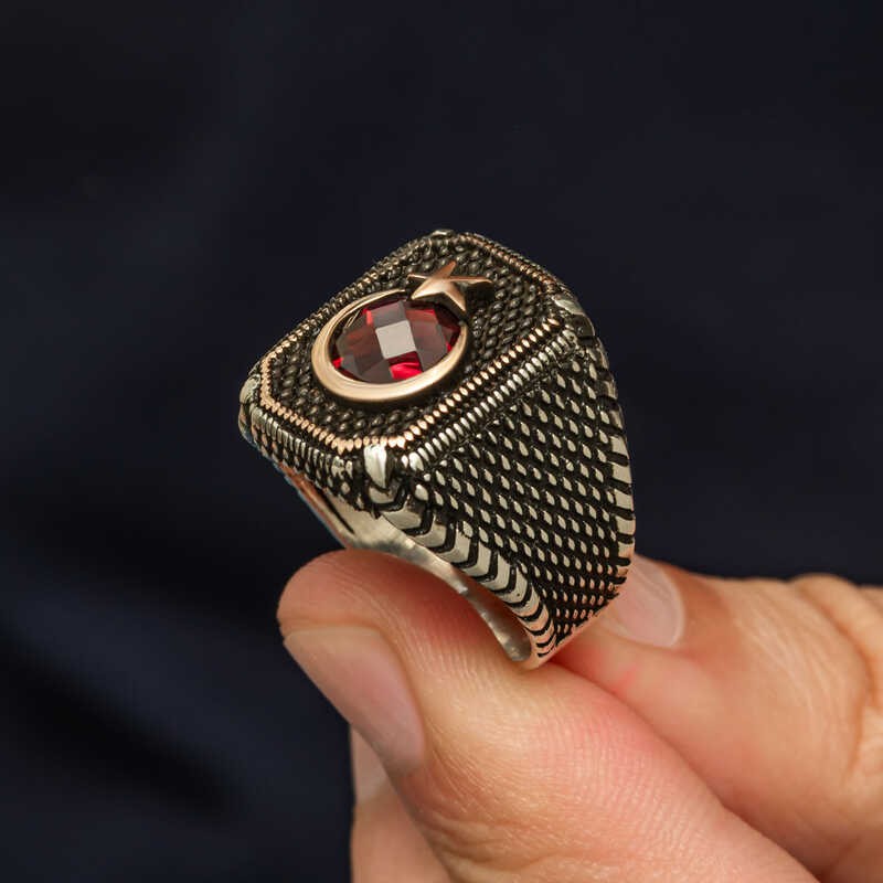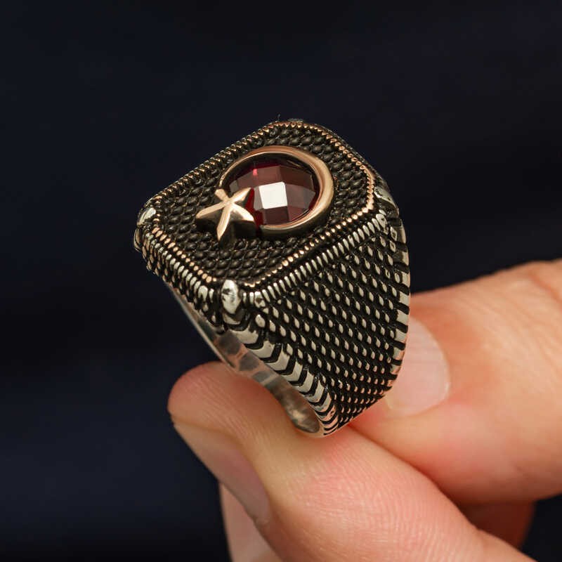 Gümüş Kırmızı Taşlı Ay Yıldız Erkek Yüzük