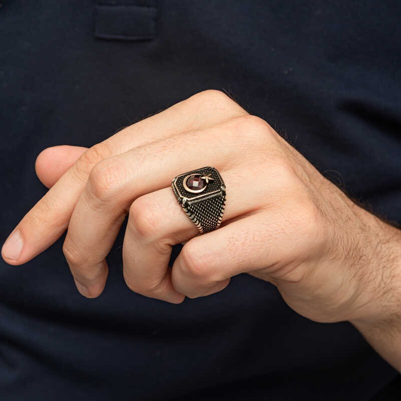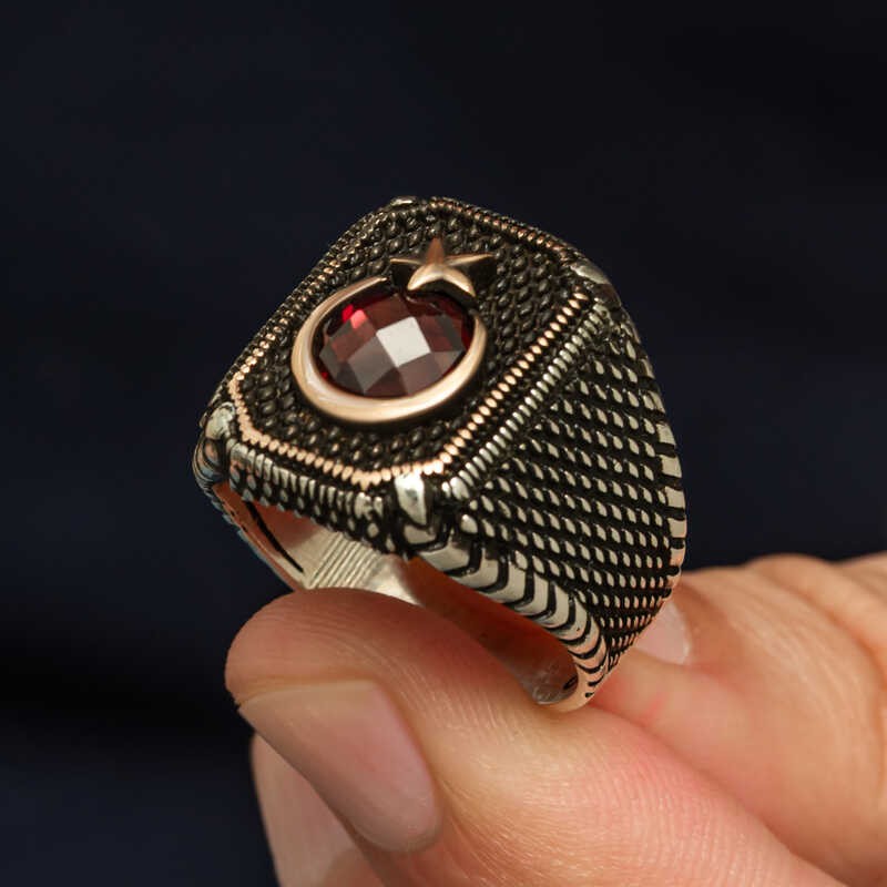 Şıklığı ve anlamlı tasarımıyla öne çıkan bu erkek yüzük,üstün kalite gümüş kullanılarak işlenmiştir.Zarif ay ve yıldız motifleriyle süslenmiş bu yüzük,göz alıcı kırmızı taş detaylarıyla tamamlanmıştır.Her detayında özen ve ustalık barındıran bu aksesuar,stilini tamamlamak isteyen erkekler için mükemmel bir tercih.Kendinize yada sevdiklerinize doğum gününde,babalar gününde yada özel günlerde hediye edebilirsiniz. Gümüş üzerine oksit kaplama yapılmıştır. Oksit kaplama yapılan gümüş erkek yüzük modelleri parlaklığını uzun süre muhafaza eder, oksitlenmesi gecikir. Gümüş ve değerli taşlar nedeniyle belirtilen ortalama ürün ağırlığında ± %10 sapma olabilmektedir.